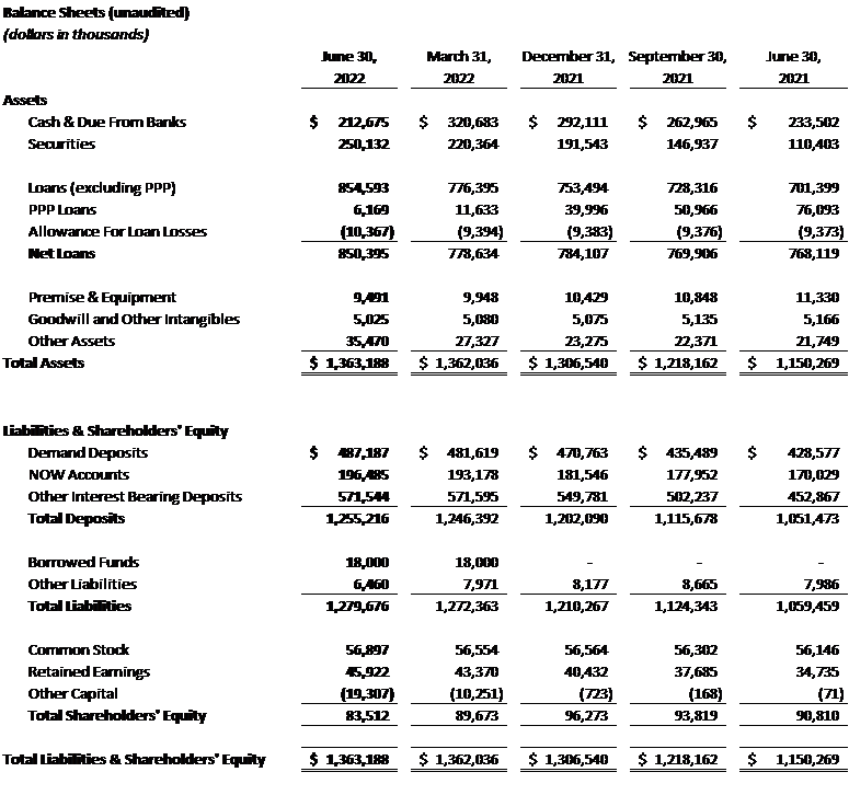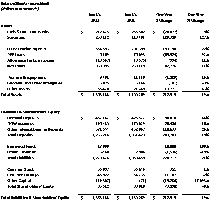 The Bank continues to experience substantial deposit growth with a 19% or $203.7 million increase in total deposits over the last year since June 30, 2021. Non-interest-bearing demand deposits increased 14% or $58.6 million over the last year. Deposit inflows from our clients have been the driving factor in the total assets of the Company increasing 19% or $212.9 million since June 30, 2021 to a total of $1.4 billion at June 30, 2022. The Company’s overall cost of funds has increased slightly to 0.12% as of June 30, 2022, primarily attributable to interest on the subordinated notes issued in February 2022.