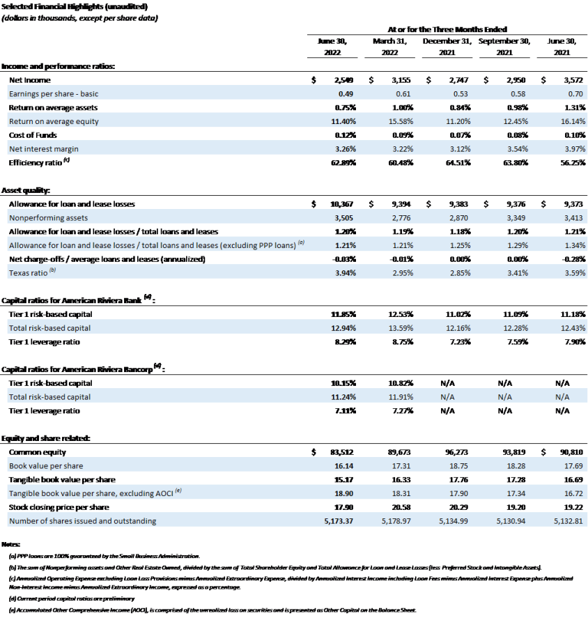 Santa Barbara, California (July 21, 2022) – American Riviera Bancorp (“Company”) (OTCQX: ARBV), holding company of American Riviera Bank (“Bank”), announced today unaudited net income of $5.7 million ($1.10 per share) for the six months ended June 30, 2022 compared to the $6.1 million ($1.19 per share) earned in the same reporting period in the previous year. Unaudited net income was $2.5 million ($0.49 per share) for the three months ended June 30, 2022 compared to the $3.6 million ($0.70 per share) earned in the same reporting period in the previous year. The decline in year to date net income in 2022 compared to 2021 is primarily attributable to higher amounts of non-recurring SBA PPP loan fee income in 2021. PPP fee income recognized was $1.2 million lower in the six months ending June 30, 2022 than recognized in the same reporting period in the previous year.