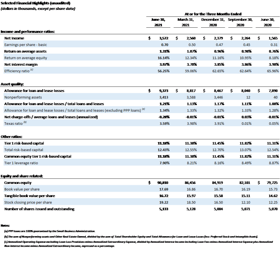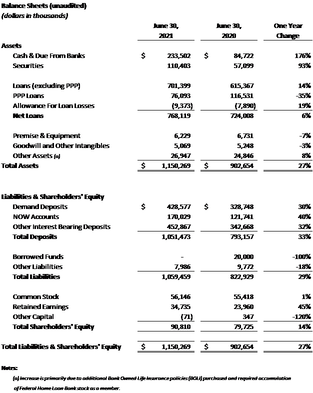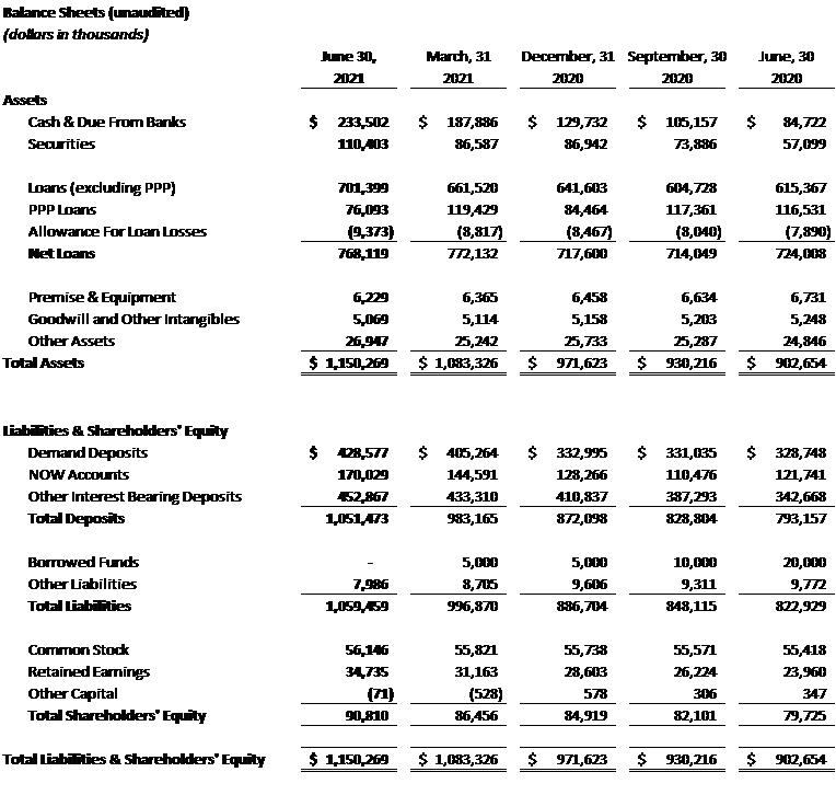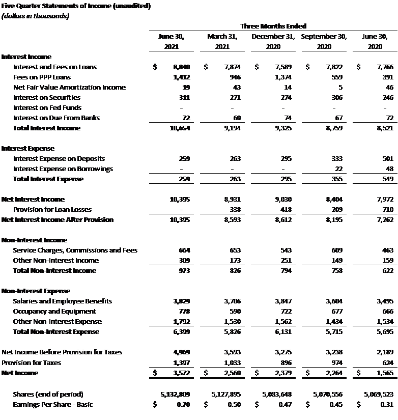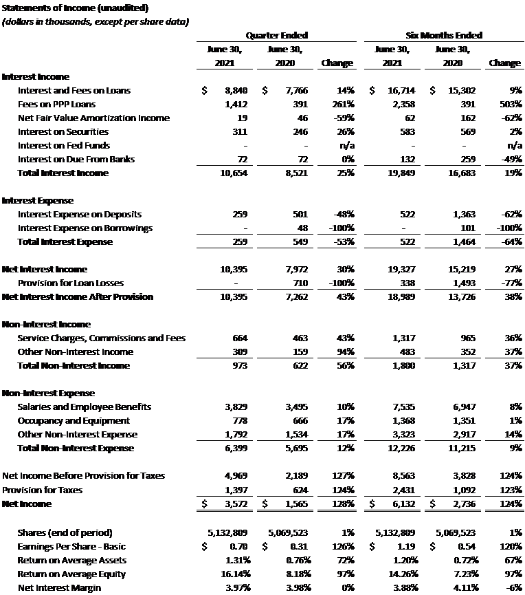 In 2021, the Bank has achieved an annualized return on average assets of 1.20% and return on average equity of 14.26%. Unaudited net income was $3,572,000 ($0.70 per share) for the second quarter ended June 30, 2021, compared to the $1,565,000 ($0.31 per share) earned in the same reporting period in the prior year. Net income in the second quarter of 2021 was positively impacted by a $751,000 loan interest recovery and accelerated recognition of Paycheck Protection Program (PPP) fee income upon loan forgiveness by the Small Business Administration (SBA).