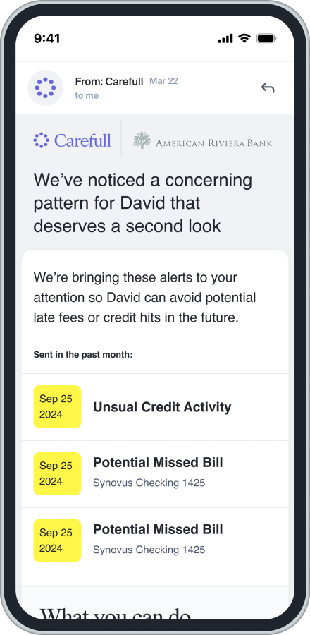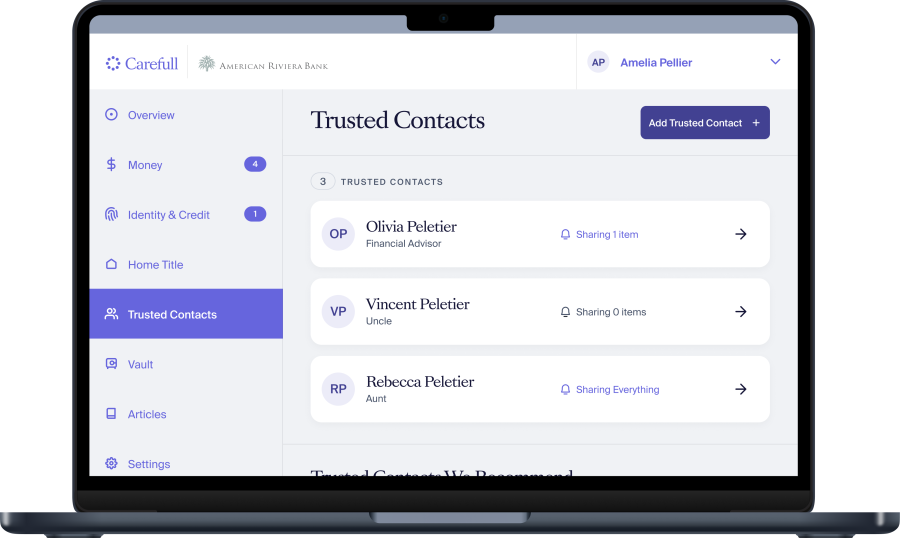 Building a strong financial safety net begins with protecting loved ones. American Riviera Bank's partnership with Carefull lets each ARB client add one additional person to the account at no cost.