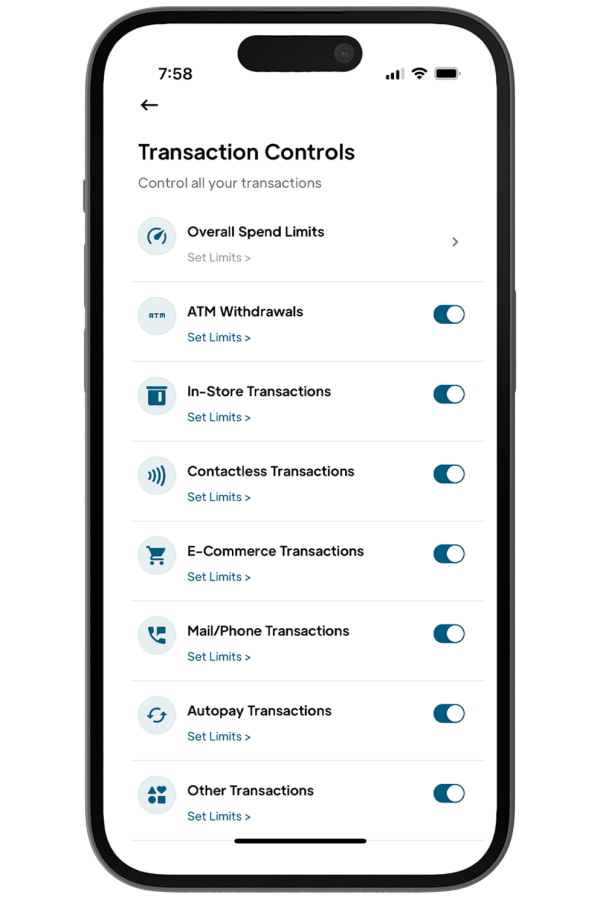 The limits you select will limit the amount you can spend using your debit card for point-of-sale (POS) transactions using the selected card. Any card transaction that exceeds the transaction, daily or monthly limit will be declined and a notification will be sent with the details.